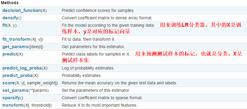 LogisticRegression类中的方法有如下几种,常用的是fit和predict