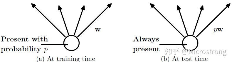 因为我们训练的时候会随机的丢弃一些神经元,但是预测的时候就没办法随机丢弃了。如果丢弃一些神经元,这会带来结果不稳定的问题,也就是给定一个测试数据,有时候输出a有时候输出b,结果不稳定,这是实际系统不能接受的,用户可能认为模型预测不准。那么一种”补偿“的方案就是每个神经元的权重都乘以一个p,这样在“总体上”使得测试数据和训练数据是大致一样的。比如一个神经元的输出是x,那么在训练的时候它有p的概率参与训练,(1-p)的概率丢弃,那么它输出的期望是px+(1-p)0=px。因此测试的时候把这个神经元的权重乘以p可以得到同样的期望。