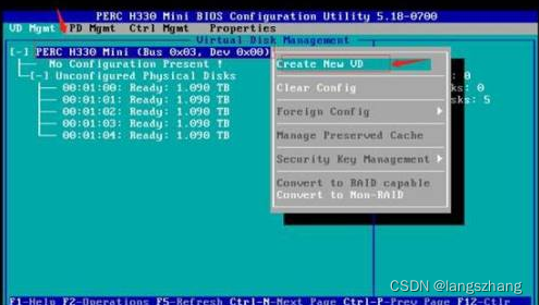 3、把选项移动到最上面:PERC H330 Mini,按F2键,选择:create New VD,创建一个raid组。如图所示: