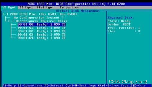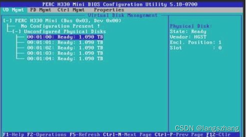 2、进入BIOS的界面,第一个VD Mgmt界面中,可以看到磁盘信息,也是raid设置的界面。如图所示: