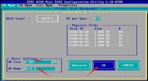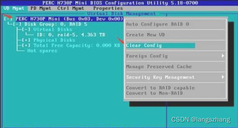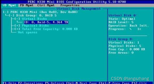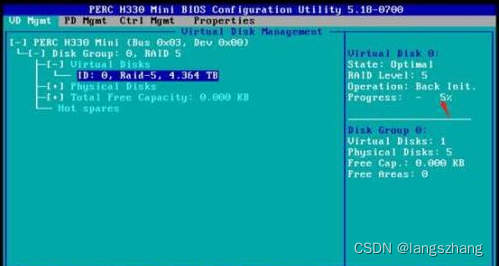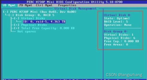 9、在VD Mgmt界面就能看到已经创建好的raid5,总的大小4.364TB。如图所示: