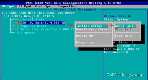 10、格式化一下刚刚创建的raid,选中到:raid-5,按F2键,初始化raid,选择:initialization--star init,如图所示: