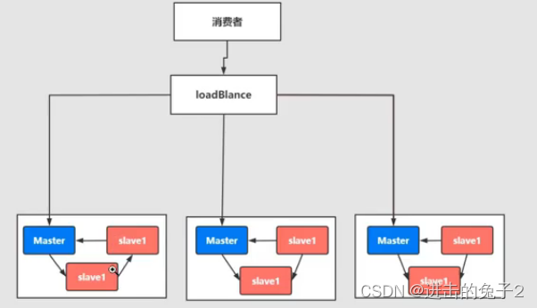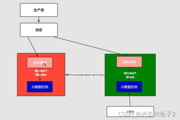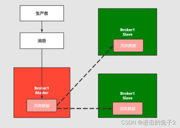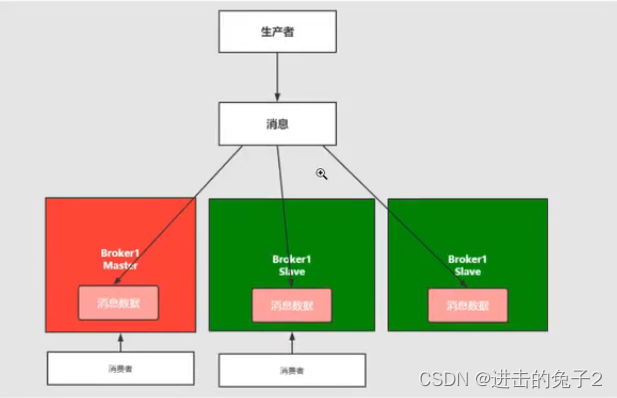 这种写入数据依然在master节点上,但同时master会同步数据到slave节点形成副本,对于存在多个消费者可以达到负载均衡效果,同时消息的拷贝和同步也会占用比较多的带宽和网络资源