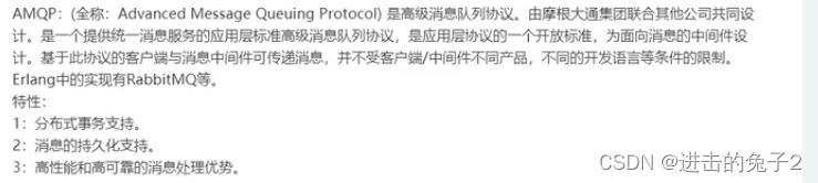 消息队列协议都是基于TCP/IP协议实现的一种约定俗成的规范,目的是让客户端(Java/Go/Python)进行无障碍通讯,且这种协议下的各种实现必须具有持久性、高可用、高可靠性能。常见的消息队列协议包括:AMQP、MQTT、kafka、OpenMessage