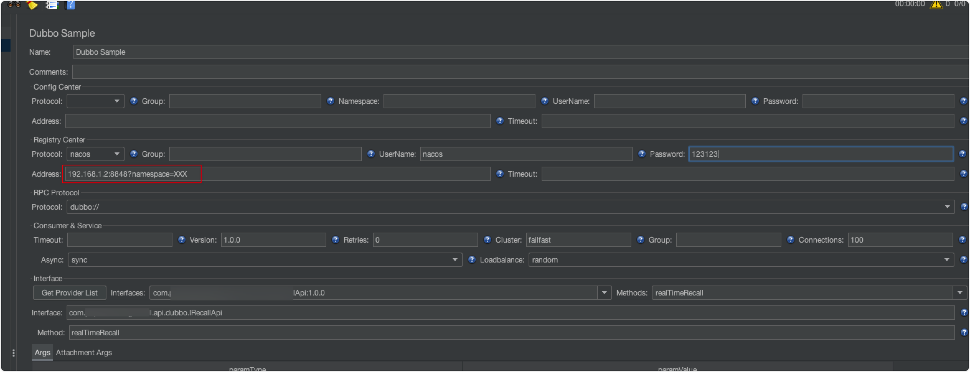 项目中用Jmeter压测Nacos为注册中心的Dubbo接口,因为建了不同环境的Namespace,public下没有对应点接口注册进去。导致Jmeter连的时候,一直没有获取到Provider List。经过一番摸索,发现连对应的namespace需要在Address中配置: