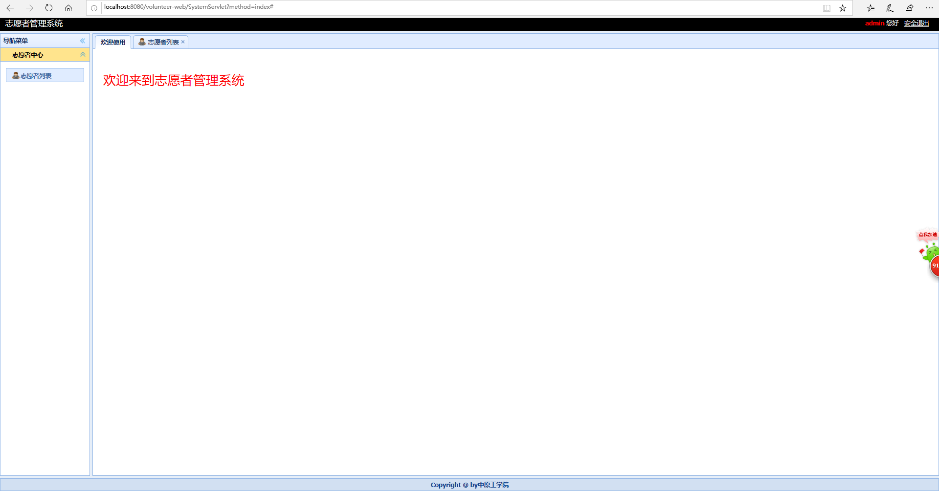 java web志愿者管理系统采用了mvc的设计思想,用到了Java 、html、js、jquery、servlet、json、mysql等技术,使用eclipse开发,mysql数据库、tomcat9.0、jdk1.8运行正常,适用于软件工程计算机专业作为实训/毕设的参考系统,也可以做ssm框架的,如果需要定制类似的系统或者源码,请关注我公众号或者加我QQ:1728608455
