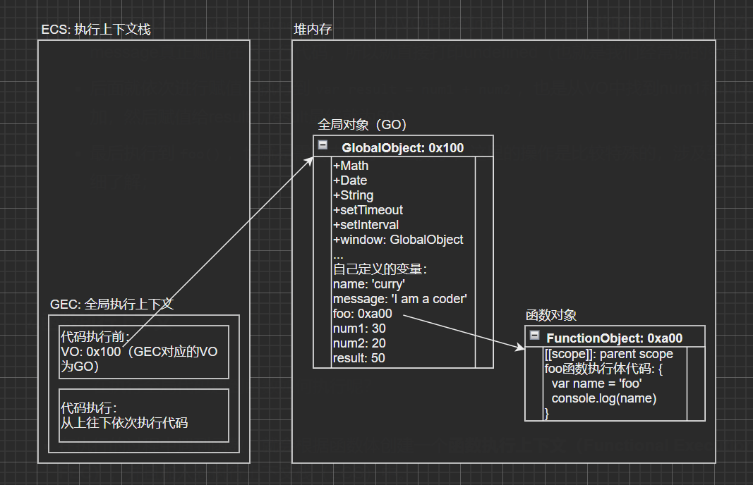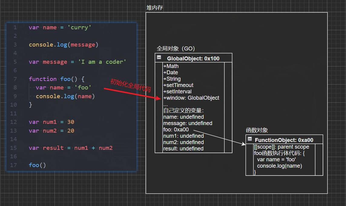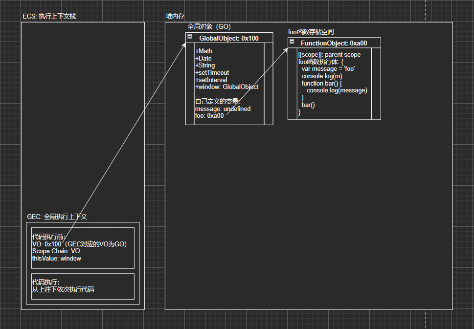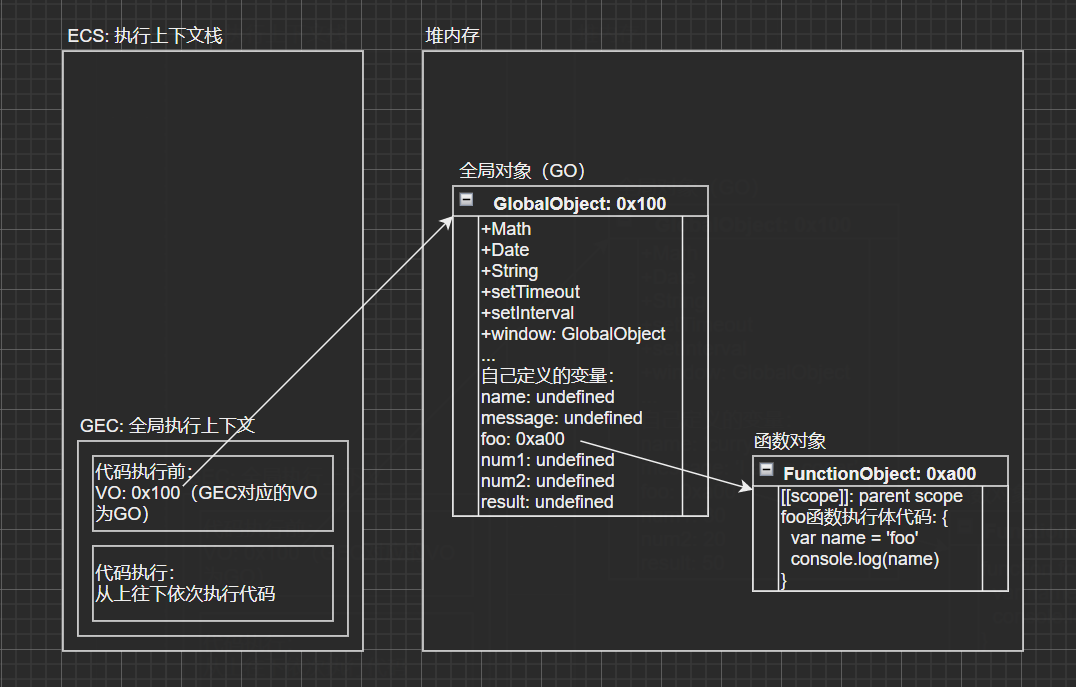 - 从上往下解析JS代码,当解析到foo函数时,因为foo不是普通变量,并不会赋为undefined,JS引擎会在堆内存中开辟一块空间存放foo函数,在全局对象中引用其地址;