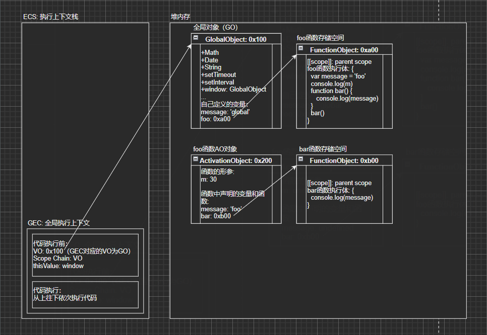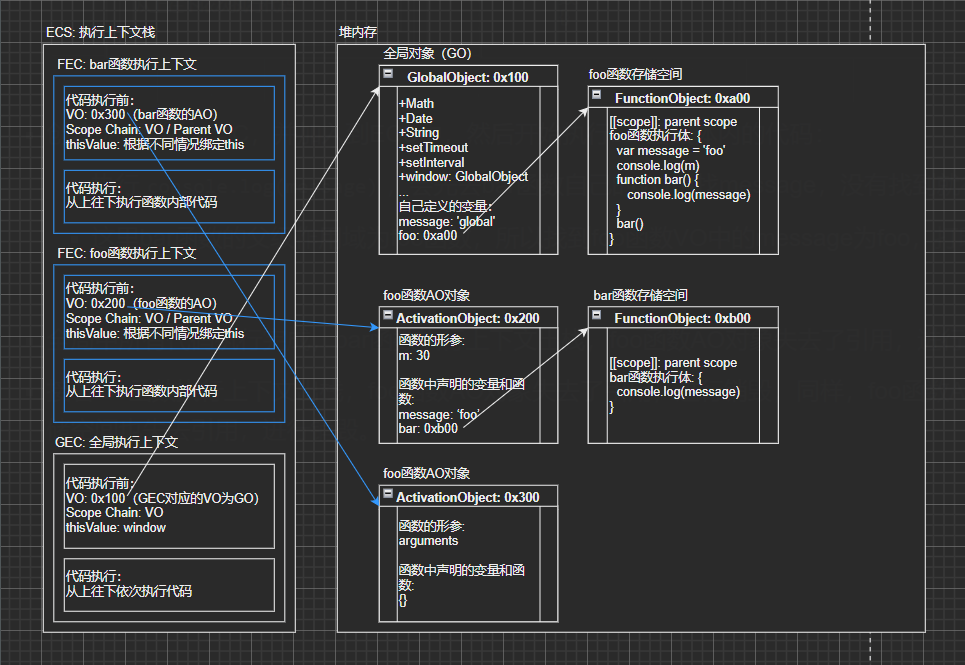 console.log(message),会先去bar函数自己的VO中找message,没有找到就往上层作用域的VO中找; - 这里bar函数的父级作用域为foo函数,所以找到foo函数VO中的message为foo,打印结果为foo;