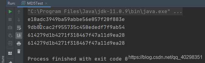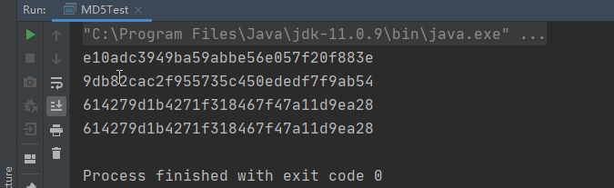 上面列举了md5算法的各种实现,包括不加盐的,加盐的,加盐加散列次数的(从HashedCredentialsMatcher的源码可得知,默认散列次数为1),还有通过SimpleHash来实现md5的方式,下面看看它们的输出: