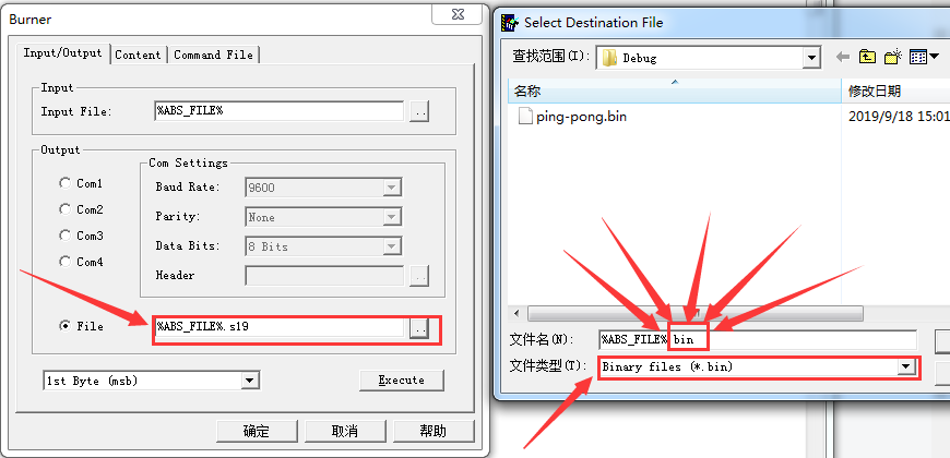 选择输出文件路径,找到要存放的路径,选择目标文件类型(转换成bin 就选bin;转换成hex 就选hex)