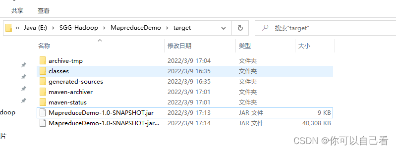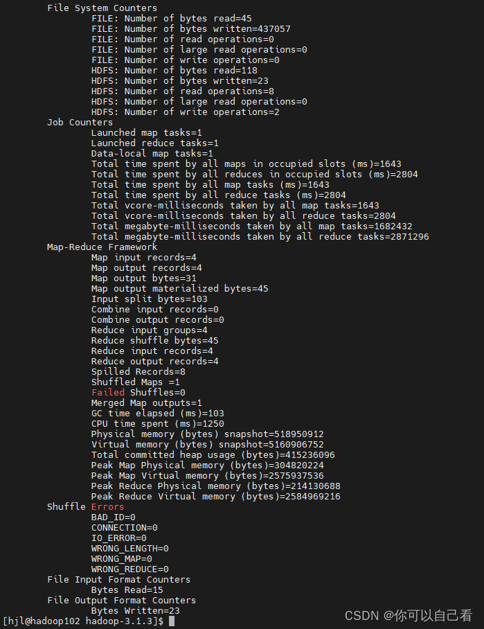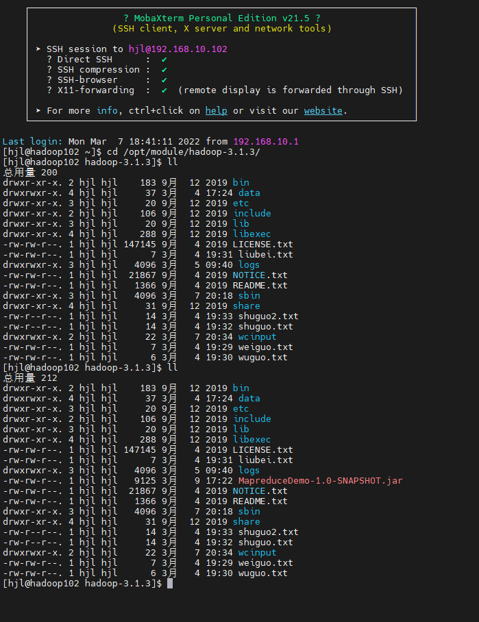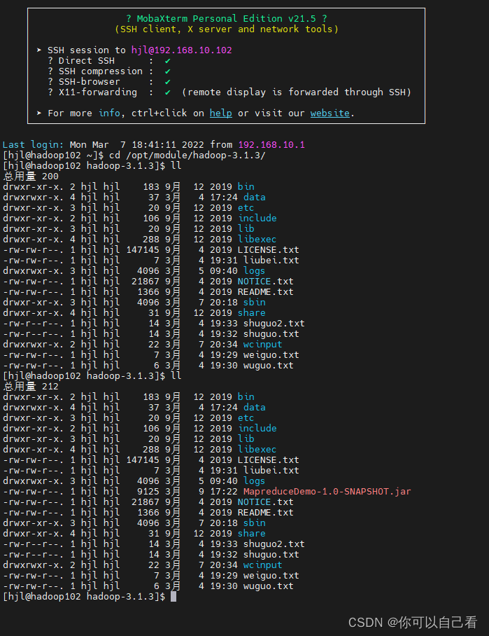然后我们使用这个jar包测试mapreduce,执行以下命令(需要保证有输入文件,具体可以看我另外一篇文章Hadoop单机和完全分布式自带Mapreduce测试_你可以自己看的博客-CSDN博客)