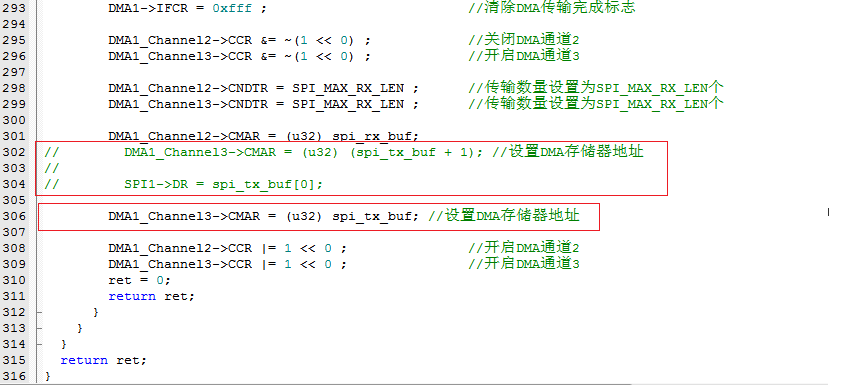 DMA1_Channel3->CMAR = (u32) (spi_tx_buf + 1); //设置DMA存储器地址