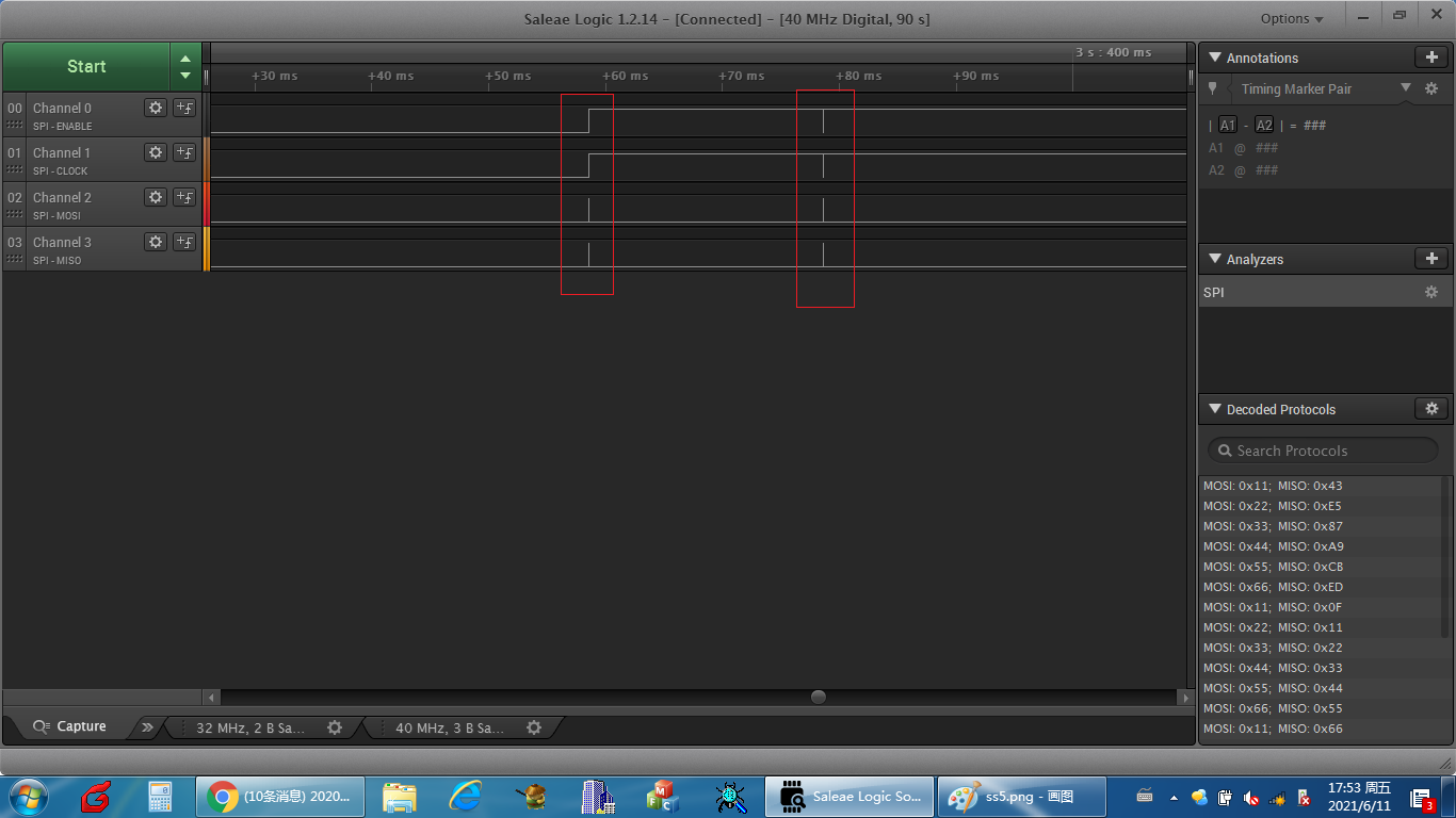 刚才描述了,主机是每隔1s给从机收发一组数据,即上边说的0x11,0x22,0x33,0x44,0x55,0x66这6个字节。下图大红框中是主机发送了3组数据。小红框中是主机每给从机收发一组数据,实际上调用了两次SPI1_DMA_ReadWrite函数,第一次是把数据发给从机,第二次是从从机读从机接收到的数据。