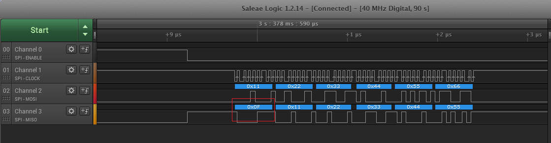 把第二个红框波形放大:即主机第二次调用SPI1_DMA_ReadWrite函数,从从机读取从机收到的数据,可以看到从机回复的是0x0f,0x11,0x22,0x33,0x44,0x55,而不是从主机收到的0x11,0x22,0x33,0x44,0x55,0x66。