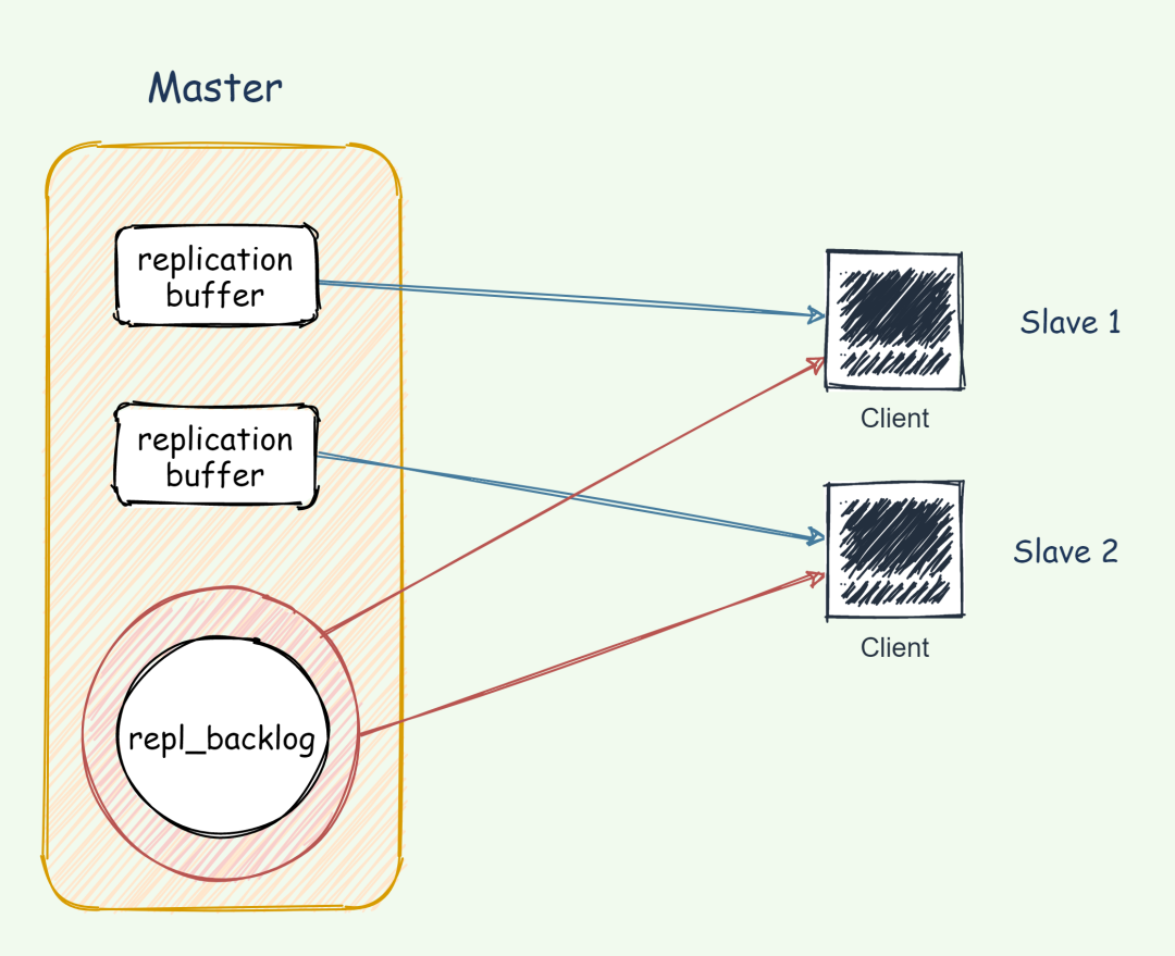 不管是主从在增量同步还是全量同步时,master 会为其分配一个 buffer ,只不过这个 buffer 专门用来传播写命令到从库,保证主从数据一致,我们通常把它叫做 replication buffer。
