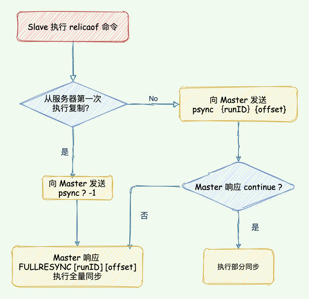 psync命令和当前服务器状态,决定执行全量复制还是部分复制:runID 与从节点发送的 runID 相同,且从节点发送的