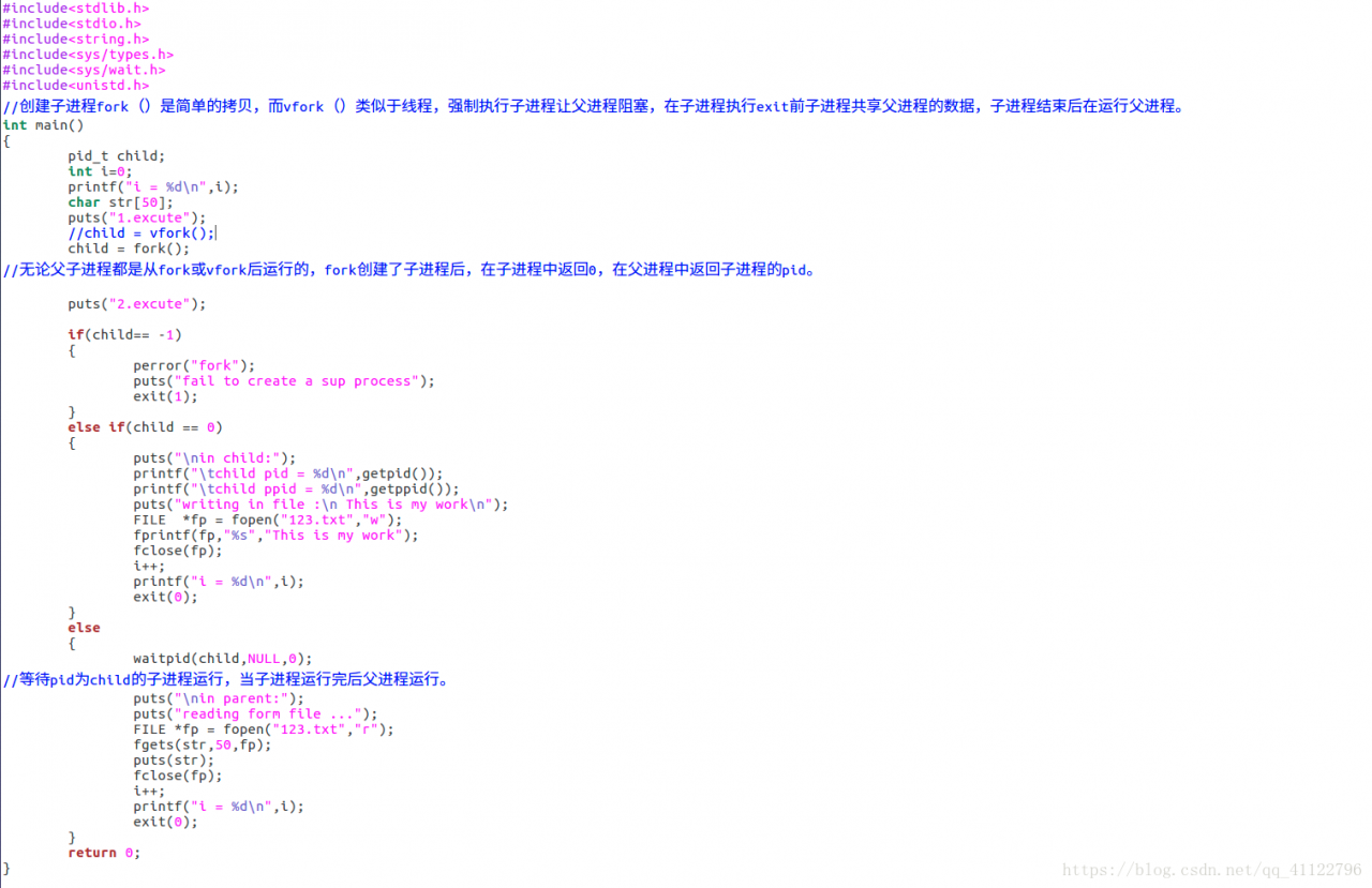 //无论父子进程都是从fork或vfork后运行的,fork创建了子进程后,在子进程中返回0,在父进程中返回子进程的pid。