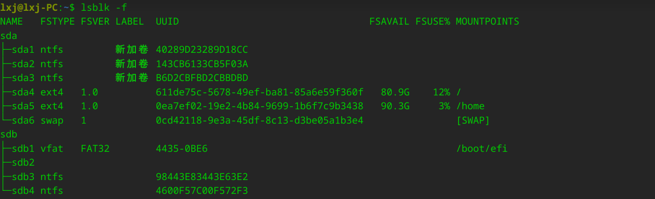 查看所有硬盘分区,及其UUID: