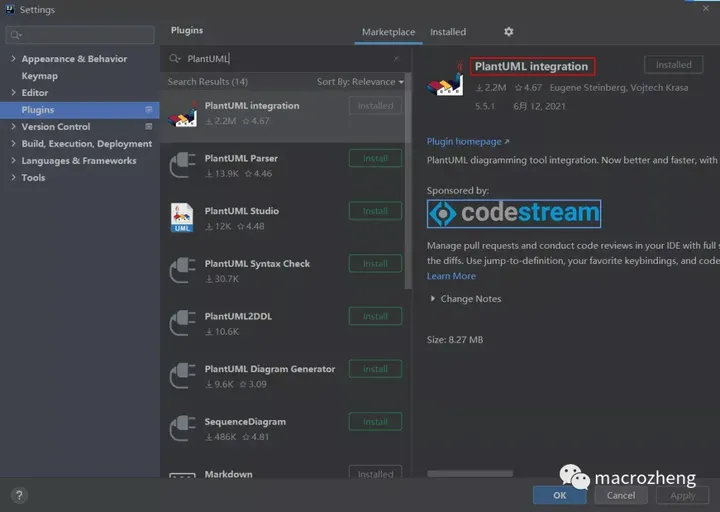 首先在IDEA的插件市场中搜索PlantUML,安装这个排名第一的插件;