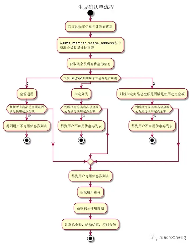 @startuml title 生成确认单流程 start :获取购物车信息并计算好优惠; :从ums_member_receive_address表中\n获取会员收货地址列表; :获取该会员所有优惠券信息; switch(根据use_type判断每个优惠券是否可用) case(0) :全场通用; if (判断所有商品总金额是否\n满足使用起点金额) then (否) :得到用户不可用优惠券列表; stop endif case(-1) :指定分类; if (判断指定分类商品总金额\n是否满足使用起点金额) then (否) :得到用户不可用优惠券列表; stop endif case(-2) :判断指定商品总金额是否满足使用起点金额; if (判断指定分类商品总金额\n是否满足使用起点金额) then (否) :得到用户不可用优惠券列表; stop endif endswitch :得到用户可用优惠券列表; :获取用户积分; :获取积分使用规则; :计算总金额,活动优惠,应付金额; stop @enduml