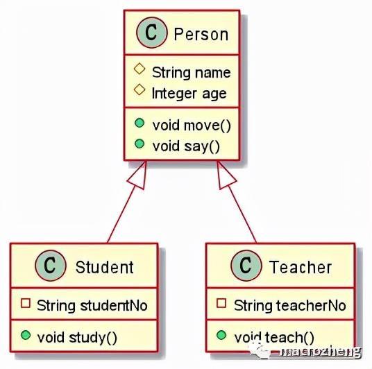 @startuml class Person { # String name # Integer age + void move() + void say() } class Student { - String studentNo + void study() } class Teacher { - String teacherNo + void teach() } Person <|-- Student Person <|-- Teacher @enduml