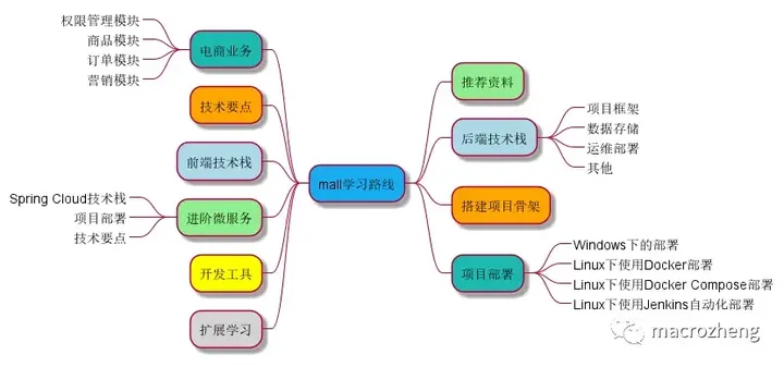 @startmindmap +[#17ADF1] mall学习路线 ++[#lightgreen] 推荐资料 ++[#lightblue] 后端技术栈 +++_ 项目框架 +++_ 数据存储 +++_ 运维部署 +++_ 其他 ++[#orange] 搭建项目骨架 ++[#1DBAAF] 项目部署 +++_ Windows下的部署 +++_ Linux下使用Docker部署 +++_ Linux下使用Docker Compose部署 +++_ Linux下使用Jenkins自动化部署 --[#1DBAAF] 电商业务 ---_ 权限管理模块 ---_ 商品模块 ---_ 订单模块 ---_ 营销模块 --[#orange] 技术要点 --[#lightblue] 前端技术栈 --[#lightgreen] 进阶微服务 ---_ Spring Cloud技术栈 ---_ 项目部署 ---_ 技术要点 --[#yellow] 开发工具 --[#lightgrey] 扩展学习 @endmindmap