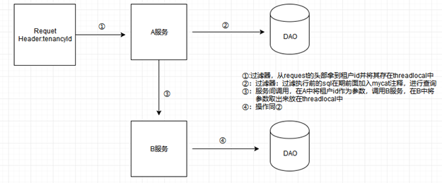服务间调用大致分两种情况,一种就是前段请求后端,后端连接mycat;另一种就是设计服务A服务B,这时就需要服务A将租户id传给服务B,然后服务B进行连接mycat。