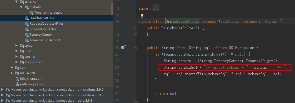 }DruidMycatFilter文件主要是重写了Druid的拦截器方法,拦截到sql后,在sql前边添加了上边提到的注解,用于指定相应的逻辑库。