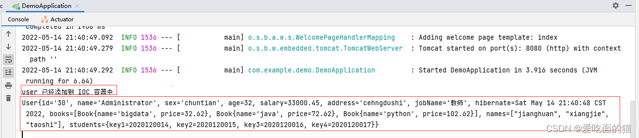 3、重启主启动类,在 DemoApplication 项目的 主启动类 中获取IOC容器,从IOC容器中获取Userbean,通过打印userbean展示配置文件中各个属性值。