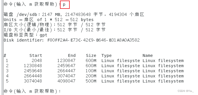 eg:使用gdisk进行分区:两个主分区,一个扩展分区(三个逻辑分区,大小分别为100M,200M,500M)