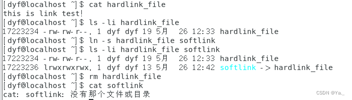 4)硬链接不能对目录进行创建,只能对文件创建;软链接可以对文件或目录创建