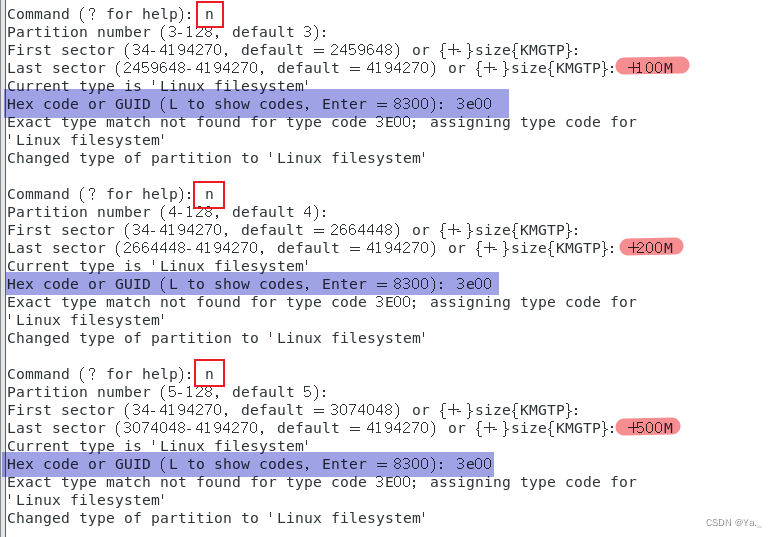 3)再次输入命令n,添加新的分区。输入命令3e00,即可创建扩展分区(三个逻辑分区,大小分别为100M,200M,500M):