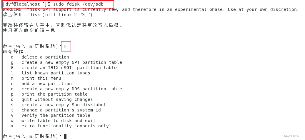 注意:千万不要在当前的硬盘上尝试使用 fdisk,这会完整删除整个系统,一定要再找一块硬盘,或者使用虚拟机。