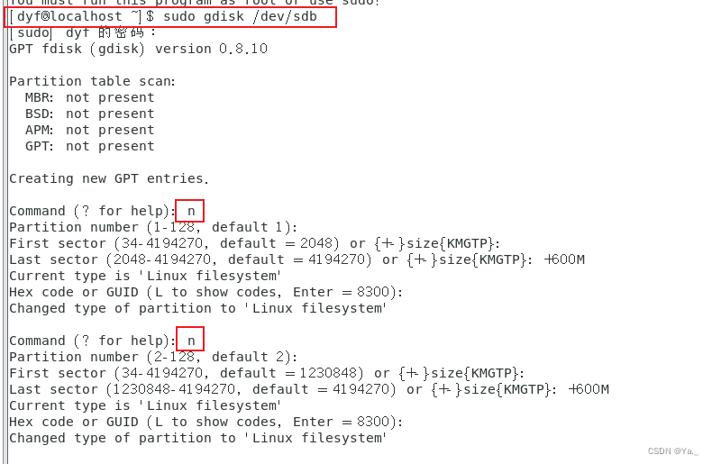 2 )使用gdisk命令进行分区,输入命令n添加新分区,如下图,两个主分区即可创建完毕: