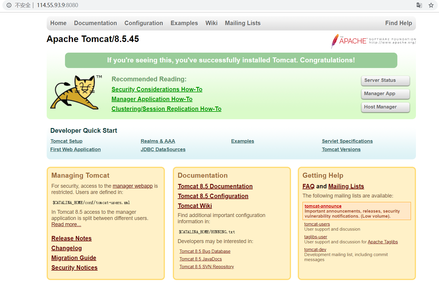 在网址上输入 IP:8080 即可显示Tomcat的界面