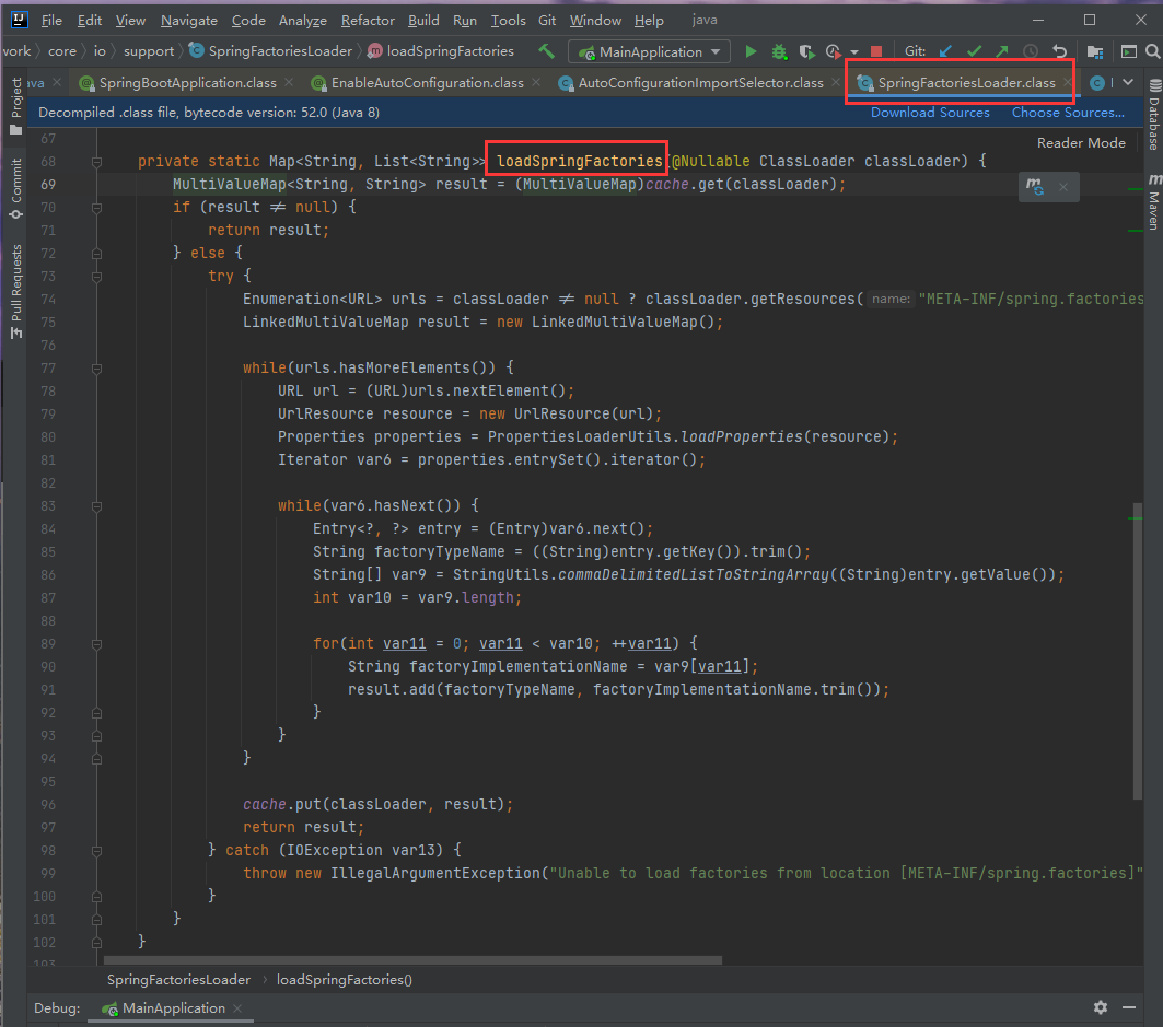4. 进入源码可知,最终是利用方法loadSpringFactories 加载所有组件。至于从哪里加载的组件,只要能看懂这个方法就能知道了。