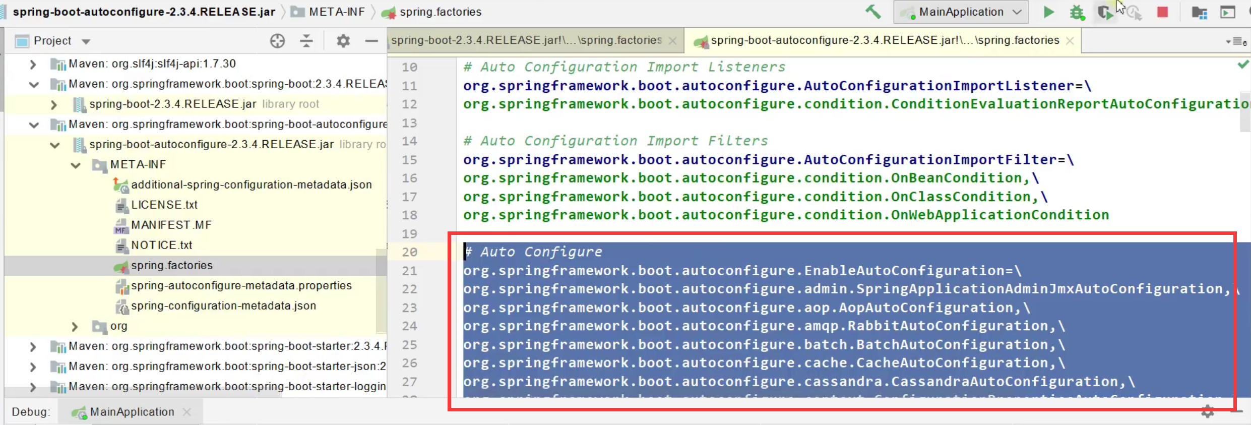 5. 观察第四步的方法,发现加载的组件路径为 META-INF/spring.factories 通过查看jar包中的相关文件spring-boot-autoconfigure-2.3.4.RELEASE.jar/META-INF/spring.factories,可知文件里面写死了spring- boo t一启动就要给容器中加载的所有配置类。