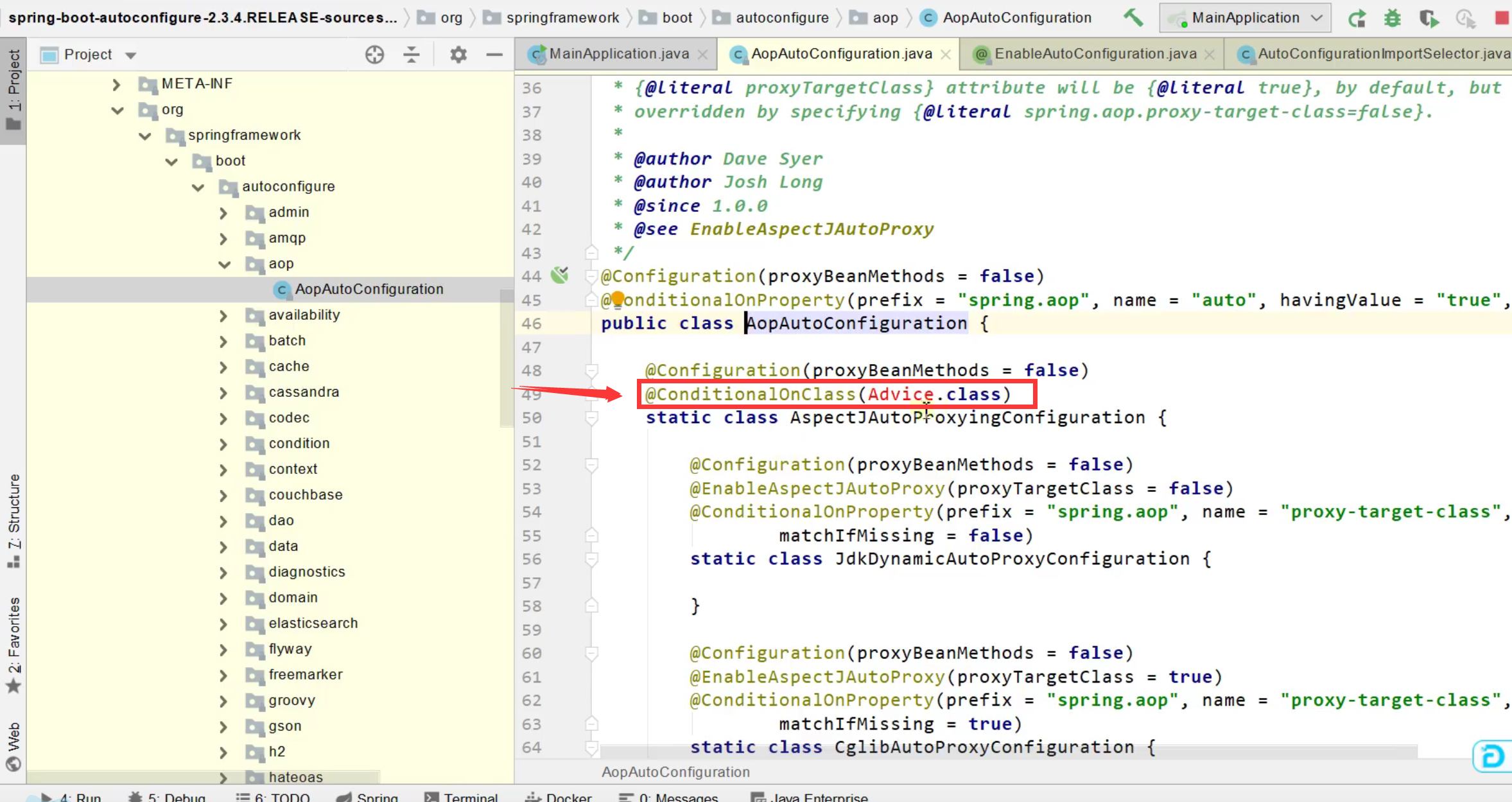 6. 虽然这127个写死的组件会全部加载,但是最终会按需配置。比如下图中的aop,他又一个注解叫@ConditionOnClass(即按需装配),也就是说他是有条件配置的。