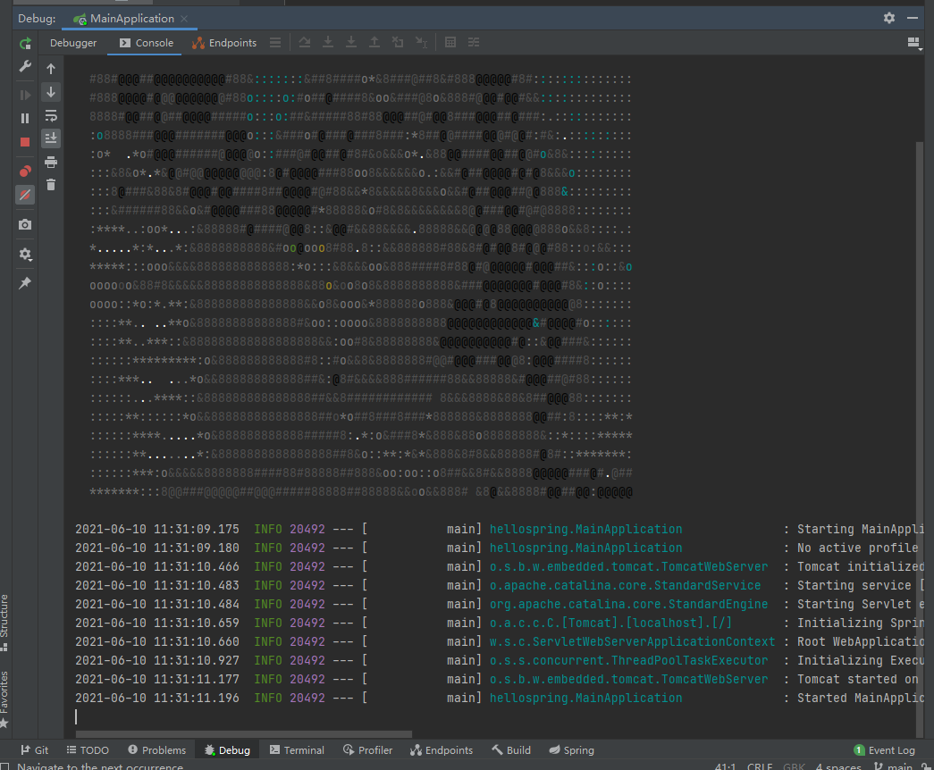 2021-06-10 11:00:14.393 INFO 3660 --- [ main] hellospring.MainApplication : Started MainApplication in 2.828 seconds (JVM running for 4.088)