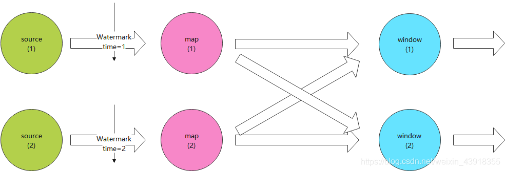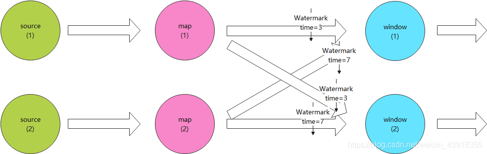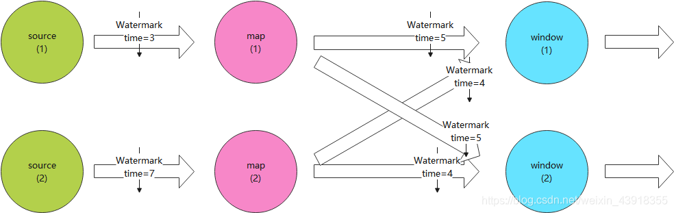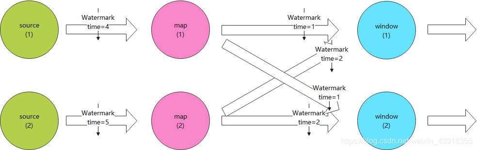 这个时候就会将较小的 watermark time=2 传递到后面, 同理当watermark time=4到来的时候, 经过比较会将 time=4传递到后面
