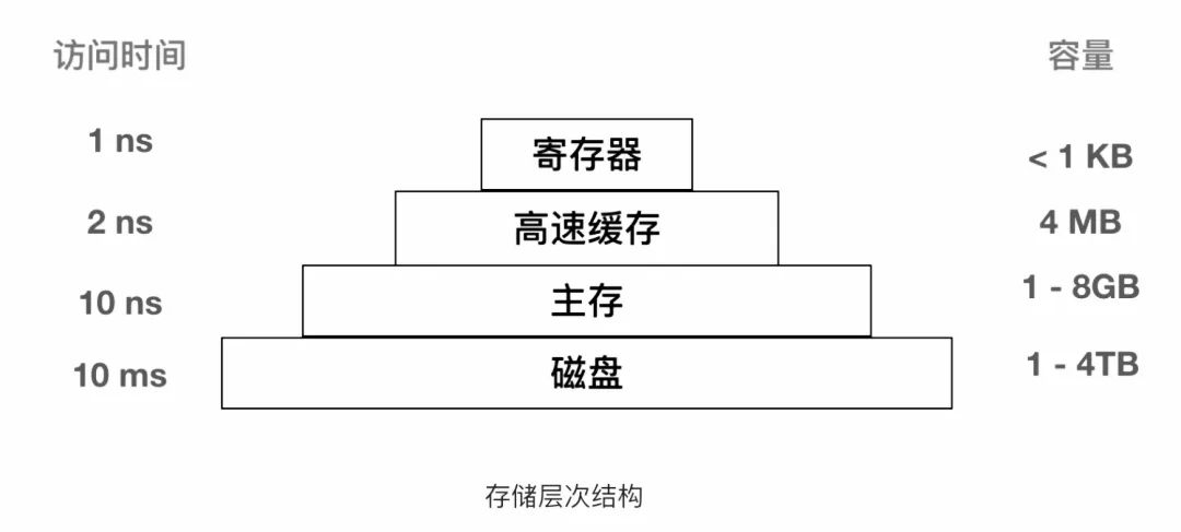 43. 存储体系结构:顶层的存储器速度最高,但是容量最小,成本非常高,层级结构越向下,其访问效率越慢,容量越大,但是造价也就越便宜。