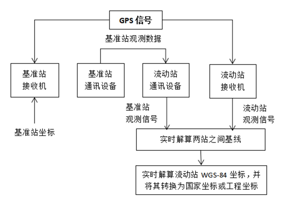 基准站建在已知或未知点上;基准站接收到的卫星信号通过无线通信网实时发给用户;用户接收机将接收到的卫星信号和收到基准站信号实时联合解算,求得基准站和流动站间坐标增量(基线向量)。站间距30公里,平面精度1-2厘米。