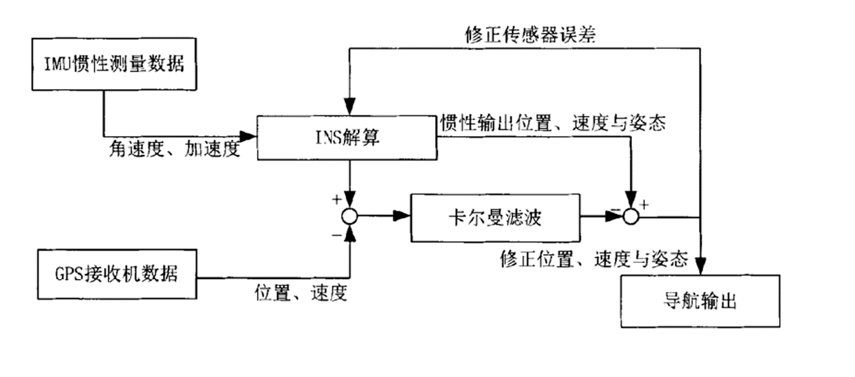 以位置、速度、姿态以及传感器误差作为卡尔曼滤波器的状态量进行估计,以INS与GPS解算的位置与速度信息作为滤波器的观测量,滤波器估计出的误差状态量用以修正INS的导航解算,从而输出车载组合系统的导航信息。