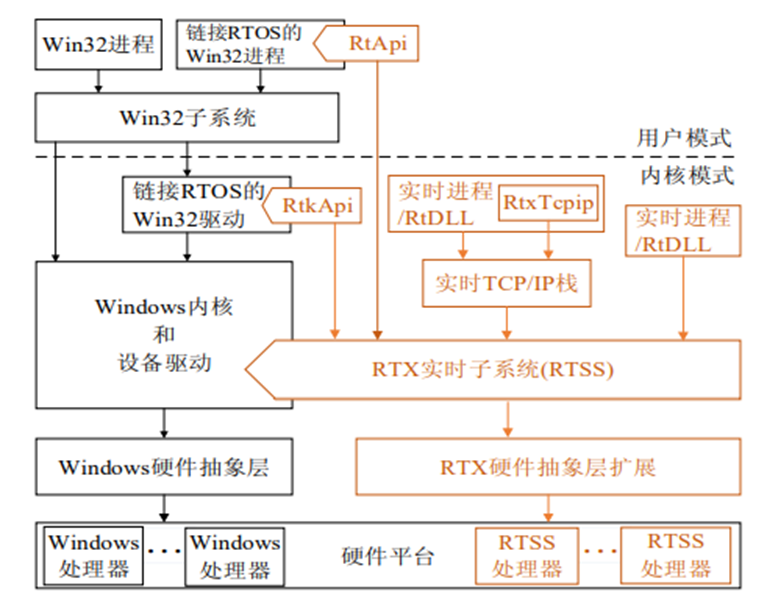 IntervalZero 公司研发的 RTX 系统是 Windows 环境下纯软件实现的硬实时操作系统,其拥有采用抢占式优先级的高效任务管理器,同时可以支持大部分C/C++语言函数库和 Win32 API。 RTX 通过对 Windows硬件抽象层(HAL)进行扩展来实现独立的内核驱动模型,并增加与 Win32 子系统并存的实时子系统(RTSS)来保证系统的实时性,RTX的体系架构如图所示。在RTX 环境下进行实时系统的开发,有以下几点优势: