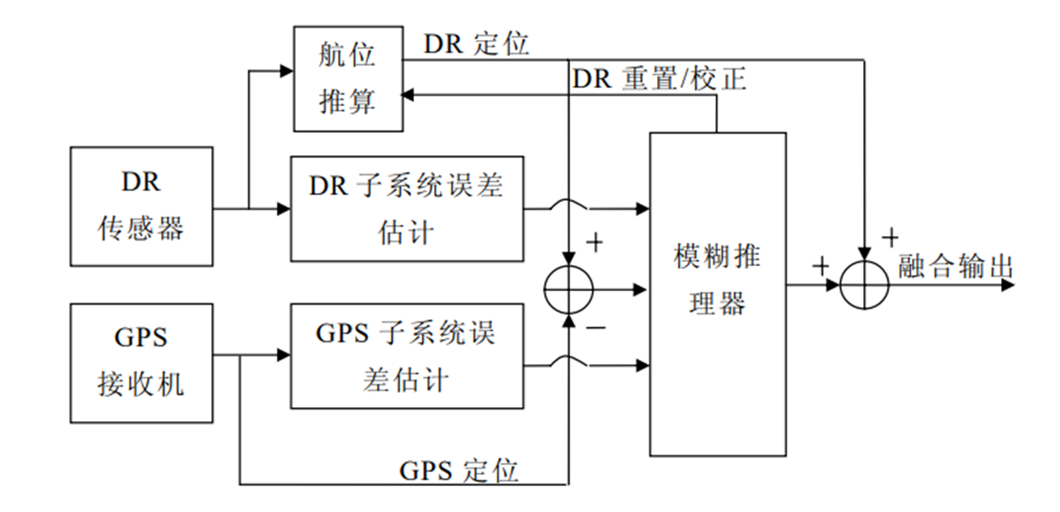 GPS 和 DR 子系统独立工作,产生各自的定位输出,两个误差估计器分别估计 GPS 和 DR 子系统的输出误差。主模糊融合器有三个输入变量:DR 子系统输出误差估计、GPS 子系统输出误差估计、DR 与 GPS 子系统输出的偏差,融合器根据三个输入量计算DR 误差补偿,与 DR 输出结果相加,得到模糊融合结果。DR 误差随时间累积,需要经常重置或校正 DR,模糊推理器根据各子系统的误差估计,以及偏差的大小,控制 DR 系统的重新初始化和实时校正。
