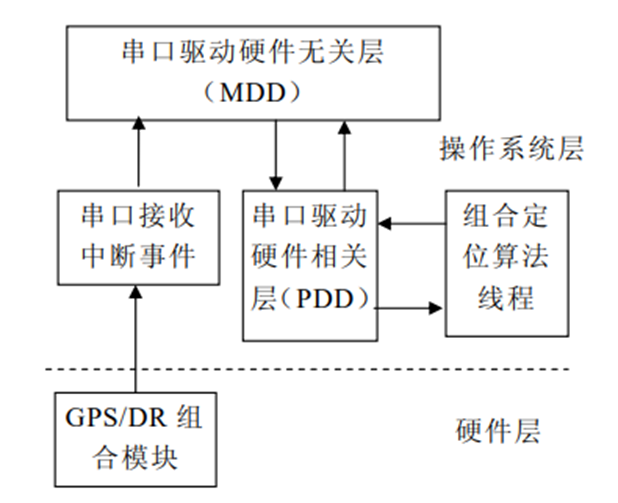 重写串口驱动 PDD(Platform Dependent Driver)层,组合定位算法在串口驱动中完成,实现原理如图所示。CPU 接收到串口数据后,产生中断信号,中断首先由 MDD(Model Dependent Driver)层处理,调用串口驱动硬件相关层 PDD。PDD 层的一般处理方法是读取中断类型(接收事件、发送事件、错误事件等),然后返回给 MDD 层,MDD 层再调用 PDD 层的相应处理函数,如读取硬件接收缓冲区的数据等。这里修改了这一实现机制,直接在 PDD 层处理接收的数据,并传送到组合定位算法线程,在该线程处理接收的定位信息,若算法线程已经完成了一次融合运算,则将融合输出传送到接收缓存区,并向 MDD 层返回一个接收事件,由 MDD 层通知应用程序有接收事件发生,否则返回一个空事件,使 MDD 不做任何处理。这种实现方法的优点是串口的处理效率提高,并且不需要对应用软件做任何修改。为了方便调试与升级维护,算法的核心部分为一个单独的动态连接库,在串口驱动初始化时加载。