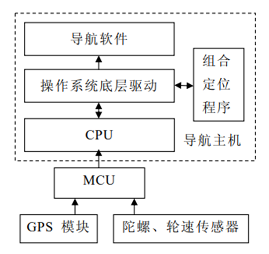 利用导航计算机的处理资源,在导航主机上实现组合定位算法,实现原理如图所示。由 MCU 采集 GPS 和 DR 传感器的信息,通过串口发送到导航 CPU。处理串口接收的信息有两种实现方法,第一种方法是不对串口驱动做任何修改,组合定位算法为一个单独的进程或线程,独占串口资源,采用标准的串口操作函数对串口进行读写,获取到 GPS 和 DR 传感器信息后进行滤波融合,通过适当的机制(如事件机制、消息机制或动态内存交换技术)将融合后的定位信息传送给导航软件。因为通常导航软件是通过对串口(或其他通信设备)的读写获取 GPS 定位信息,因此这种方法要对导航软件的定位信息获取方式进行修改。