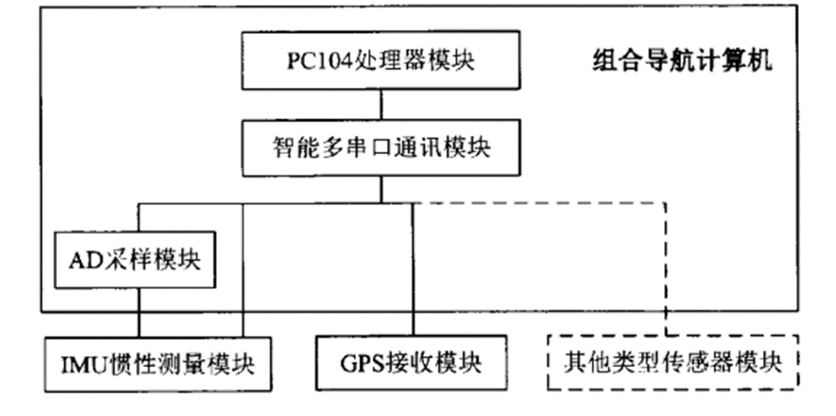 嵌入式组合导航系统硬件平台包括处理器模块、A/D采样模块与智能多串口通讯模块,计算机系统。
