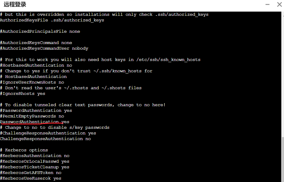 上图画红线的那句话,PasswordAuthentication,默认状态是 “no”,修改成上图中的 “yes”