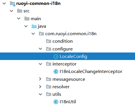 4.因为ruoyi-springCloud版本是基于Nacos读取配置文件,所以在在配置类编写时,读取国际化配置文件,可以相对比较灵活。以下是介绍下比较关键的几个类